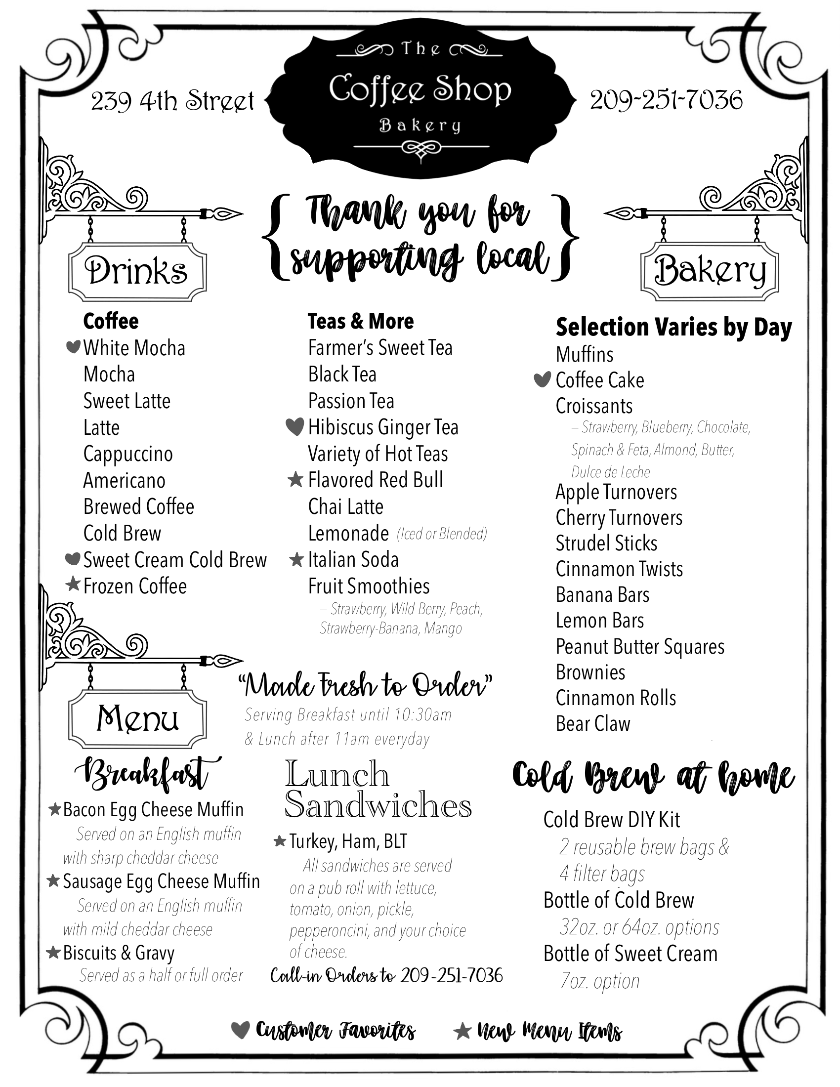 Designed the main logo and other graphics for the local business in Galt called “The Coffee Shop Bakery” that is used for branding and display purposes in their storefront and on social media.
